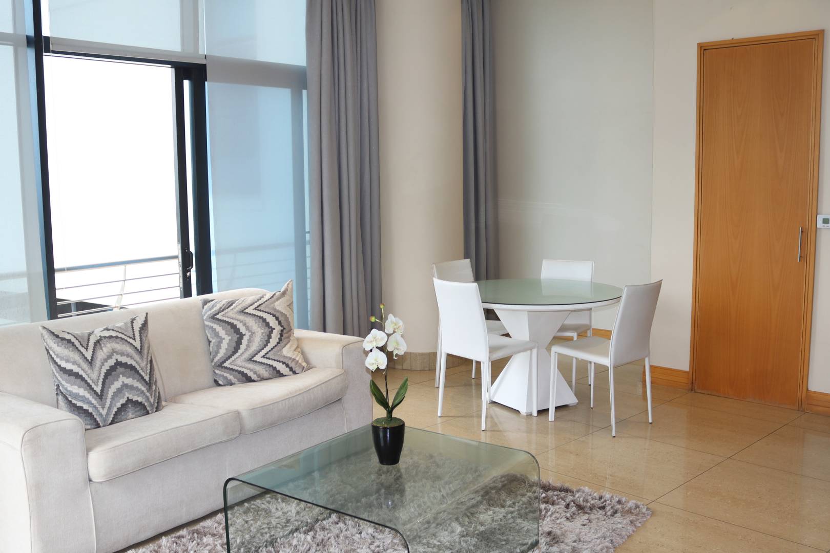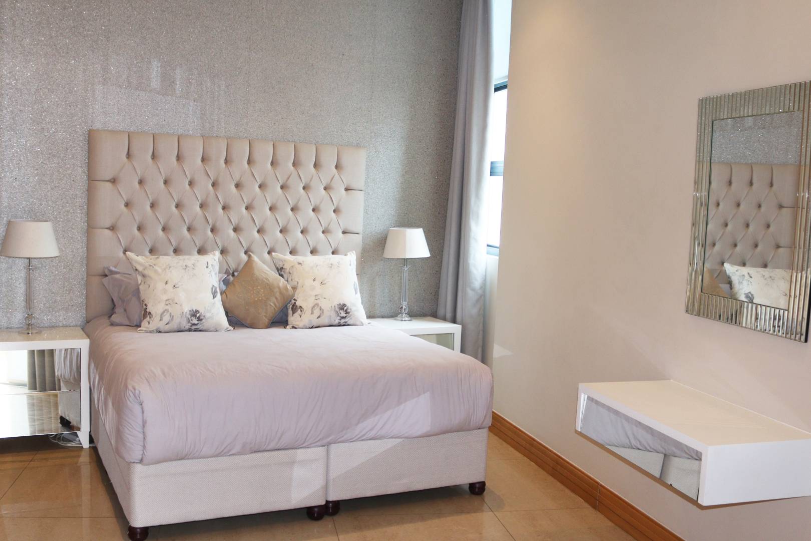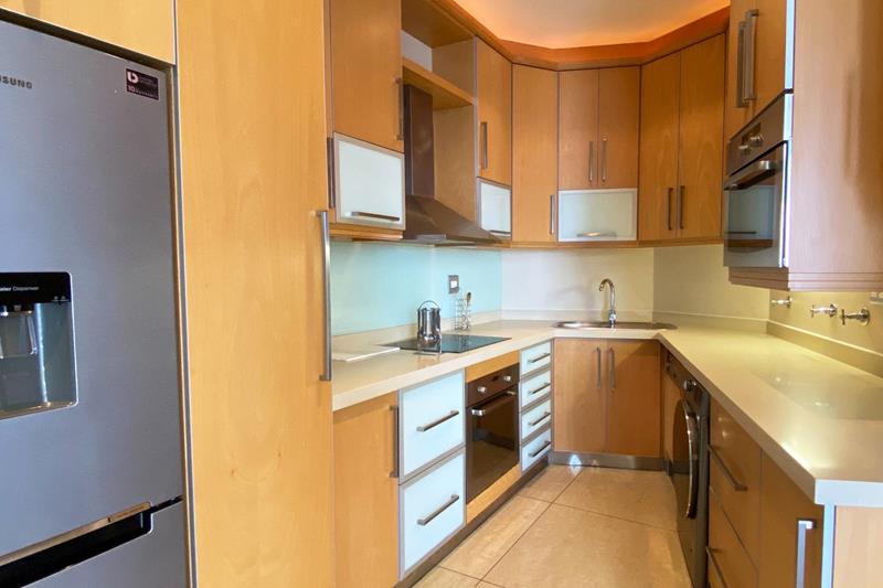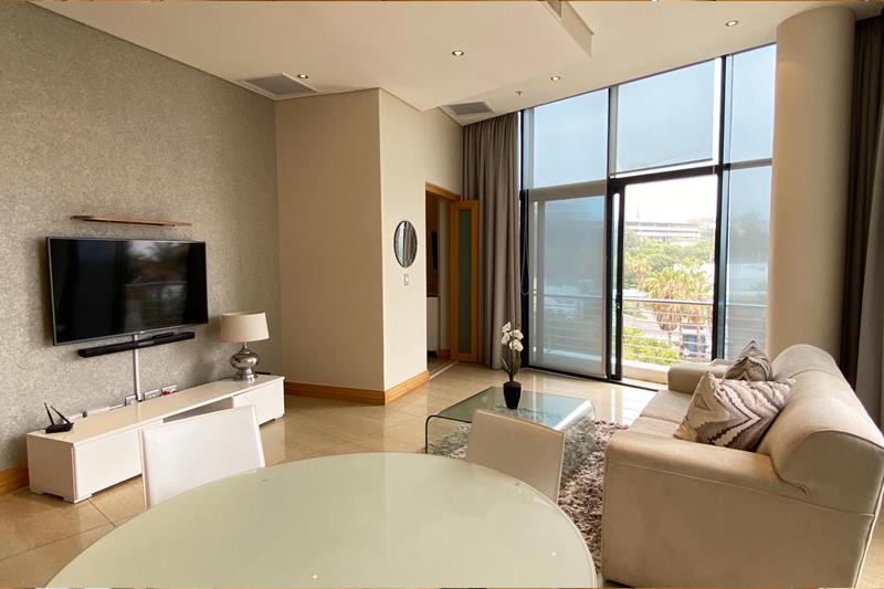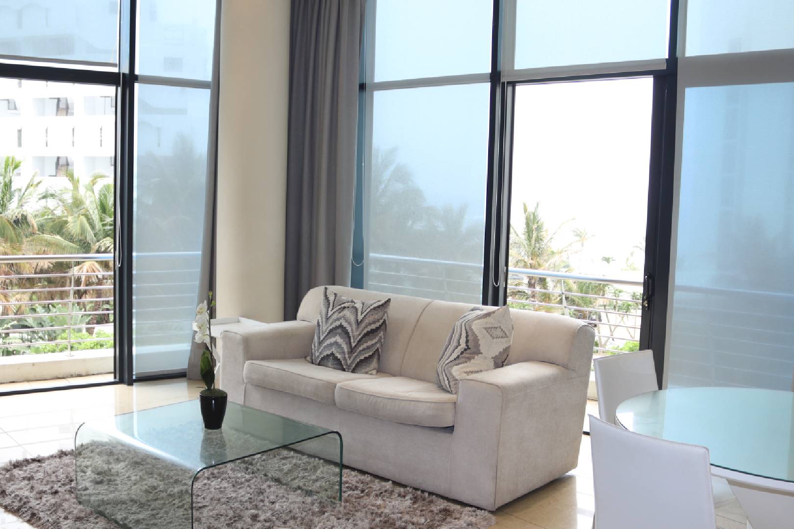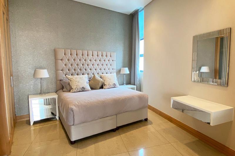 This contemporary apartment offers a spacious, open-plan living and dining area flowing onto a private balcony with spectacular views of the warm Indian Ocean and the vibrant Durban skyline. The space is fully furnished with high-quality pieces, creating an elegant, move-in-ready environment.