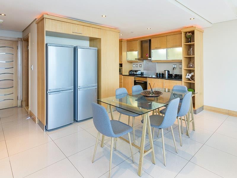 This exquisite 2-bedroom, 2.5-bathroom apartment offers a perfect balance of spacious design and modern luxury. The open-plan living area is designed to create a seamless flow, with ample space for both the dining area, which comfortably seats six, and the stylish kitchen. Equipped to accommodate all necessary appliances, including a double fridge and sink, the kitchen is ideal for both everyday use and entertaining guests.