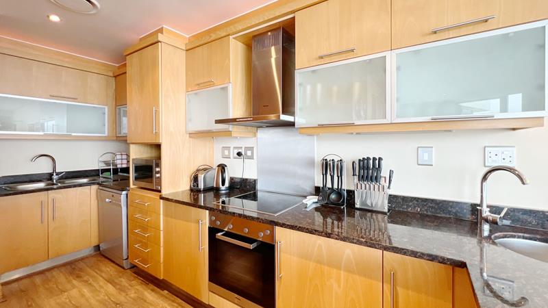 The living area, adorned with elegant wooden floors, features floor-to-ceiling windows that provide panoramic sea views over the warm Indian Ocean. The design gives you the sensation of being on the top deck of an ocean cruiser. The kitchen is both comfortable and practical, equipped with a Miele Oven/Hob for all your culinary needs.