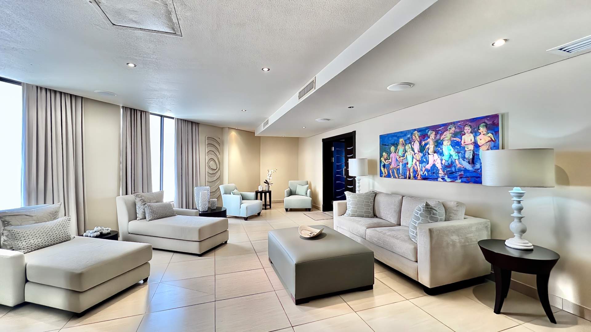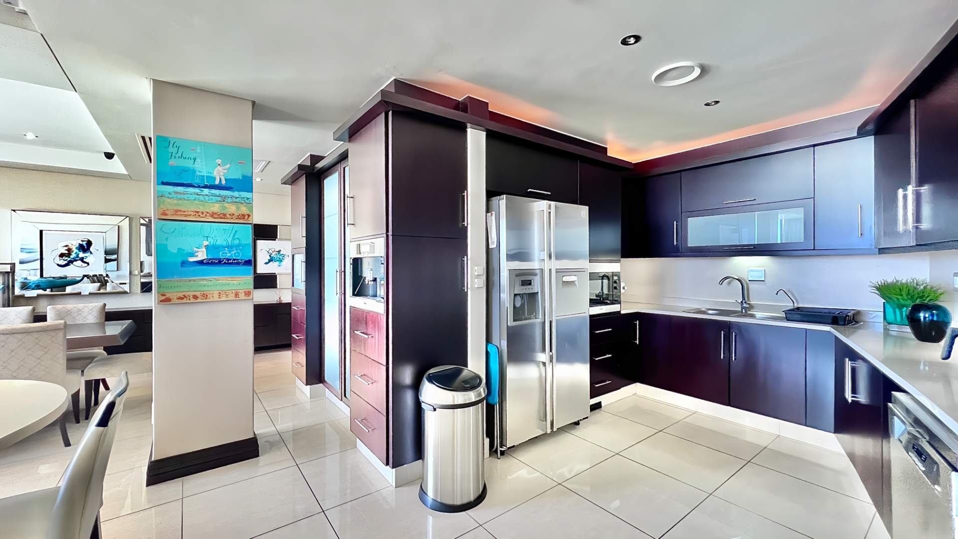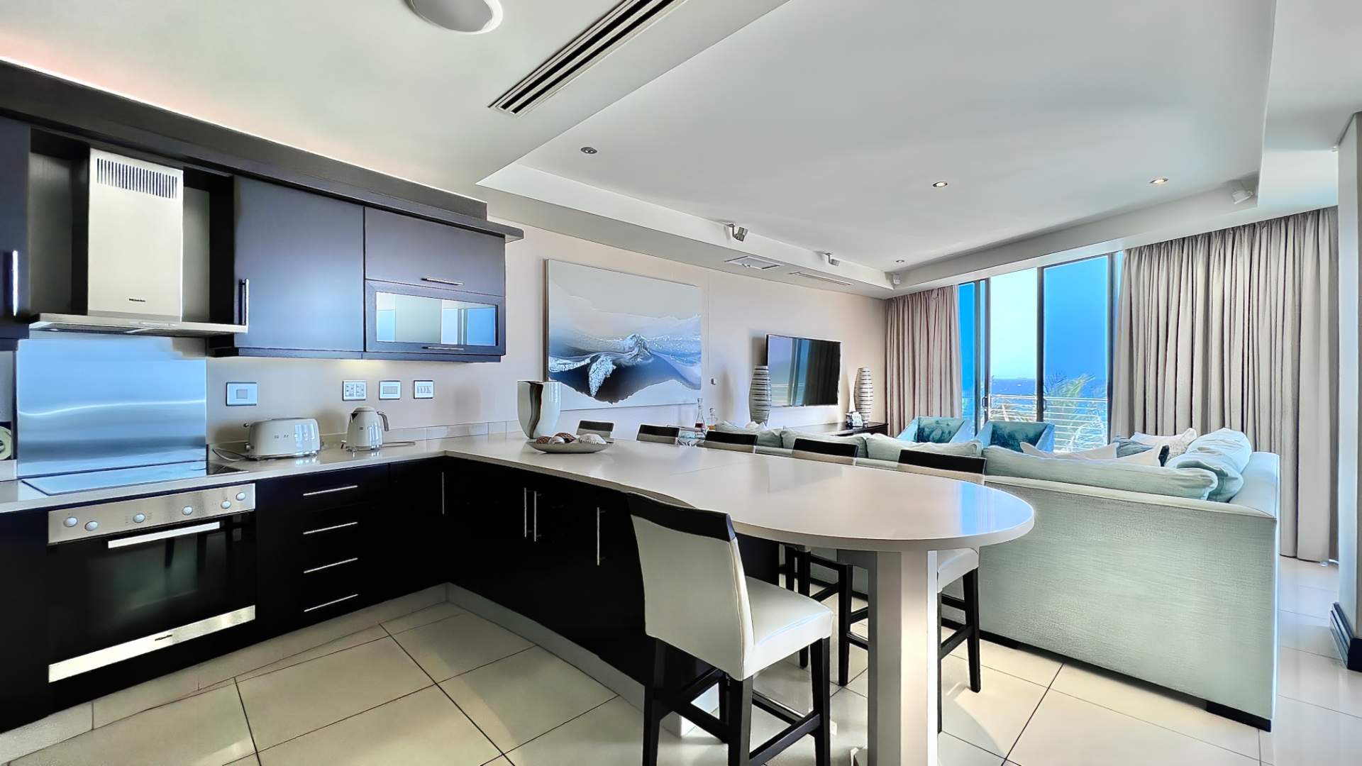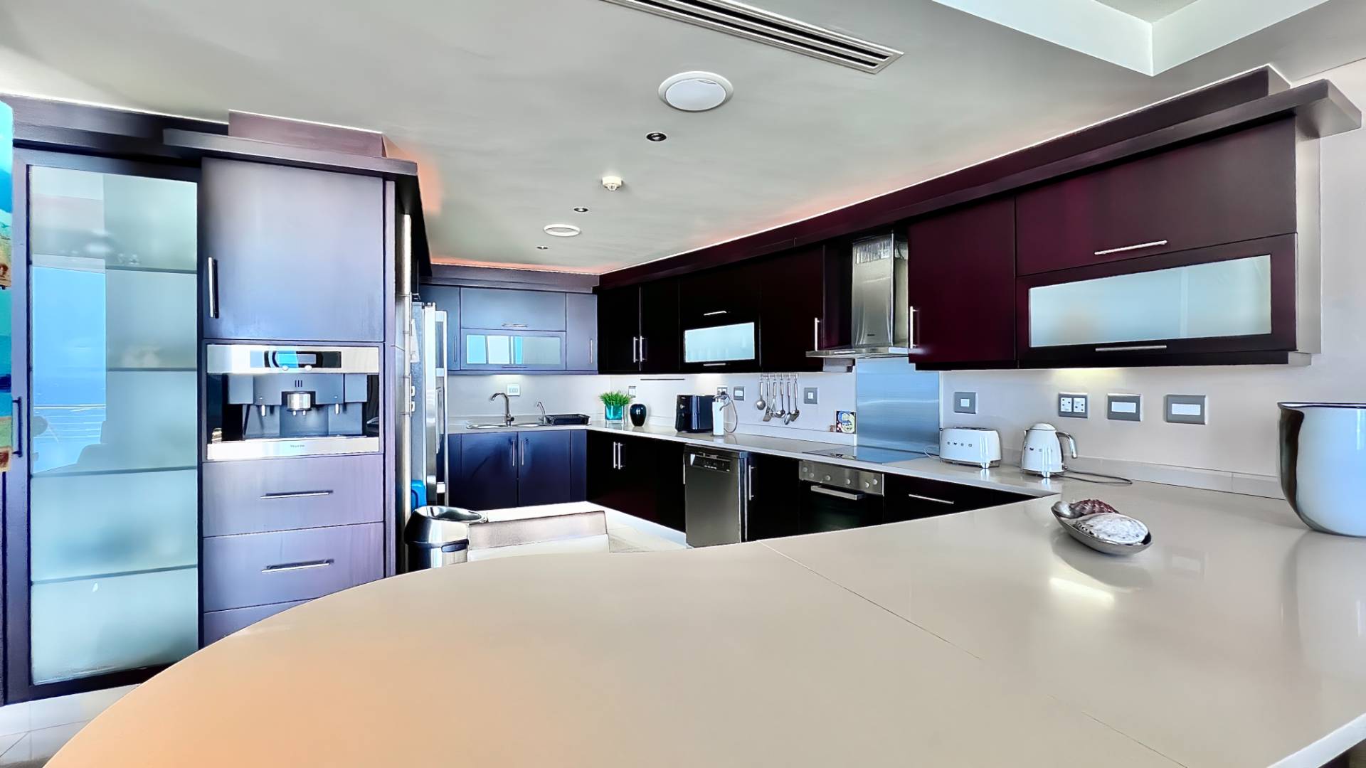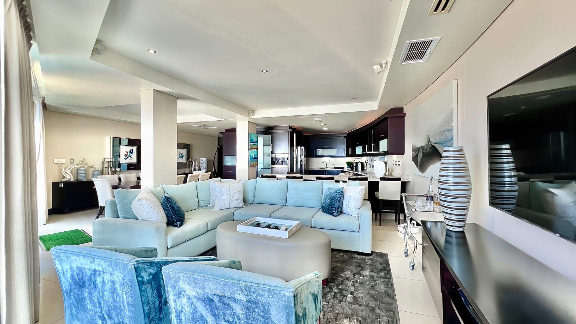 The heart of the apartment is the expansive open-plan kitchen, dining, and living area. Floor-to-ceiling windows run along one side, opening onto a spacious balcony with outdoor seating and spectacular ocean views, made even more impressive by the apartment’s position right on the beach. The dining area comfortably seats ten, making it ideal for entertaining, while the kitchen offers space for all appliances, including a double fridge and double sink.
