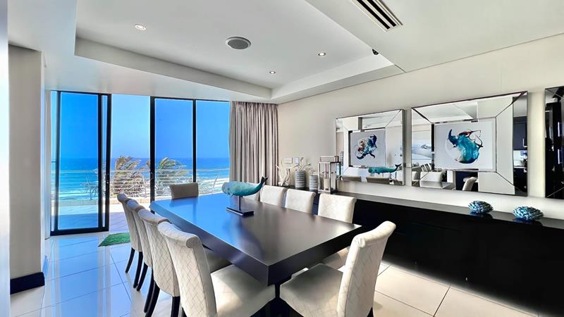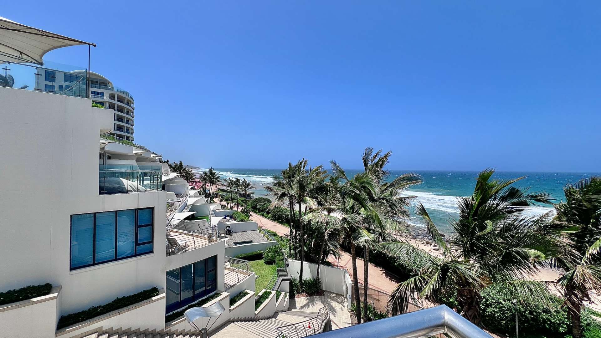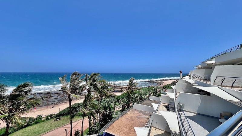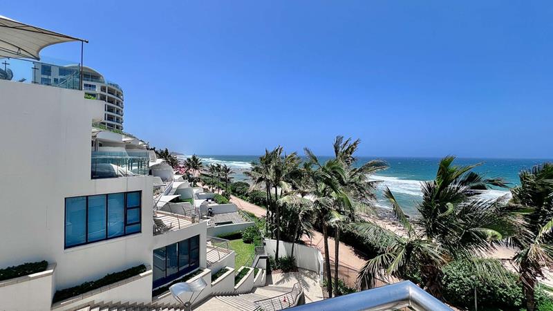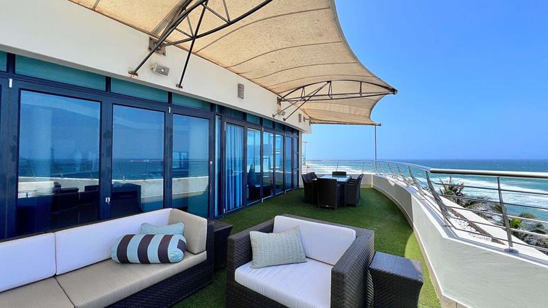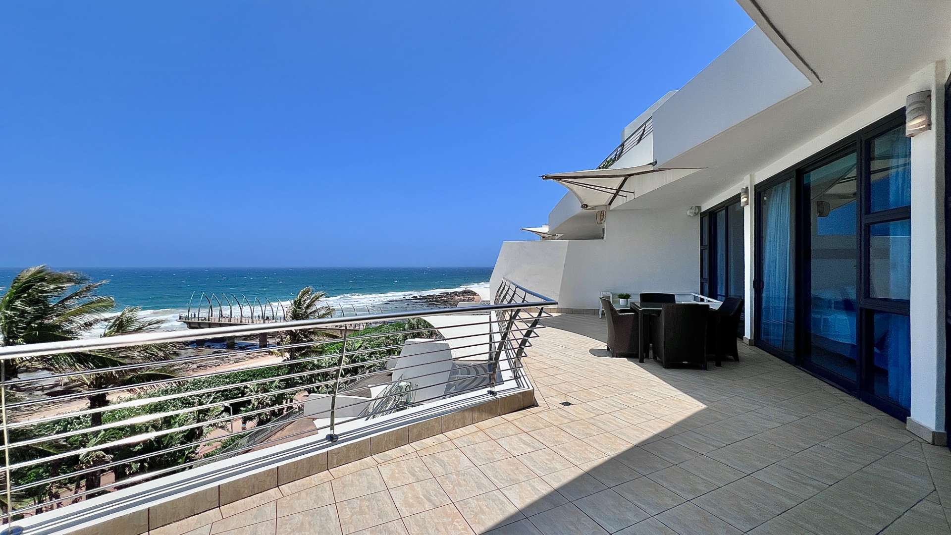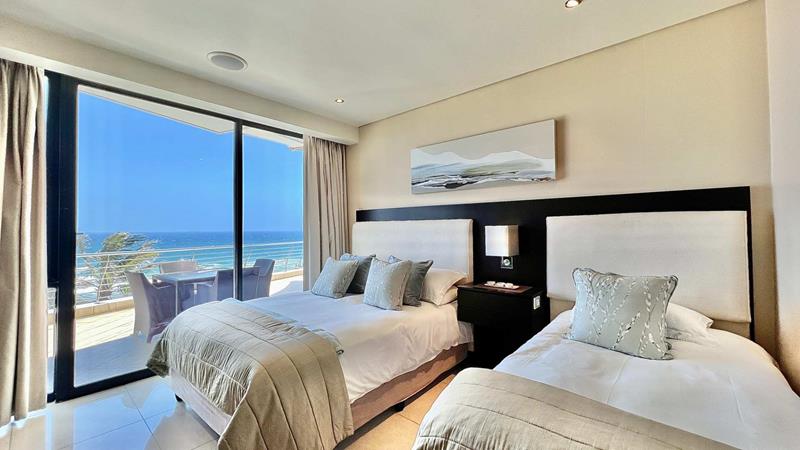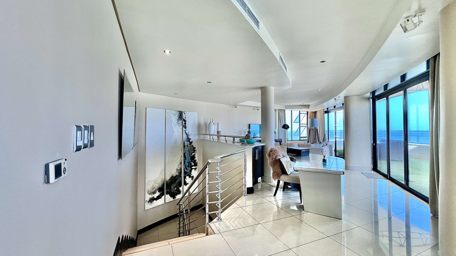 Upstairs, the apartment continues to impress with a dedicated entertainment area, opening onto another large balcony with space for outdoor seating and dining, as well as a private pool. The third bedroom is located on this level, also en-suite, with a double basin and bathtub, and direct access to the upper balcony. With multiple entertainment areas, generous proportions, and true beachfront positioning, this apartment offers a unique coastal lifestyle rarely found in Umhlanga.