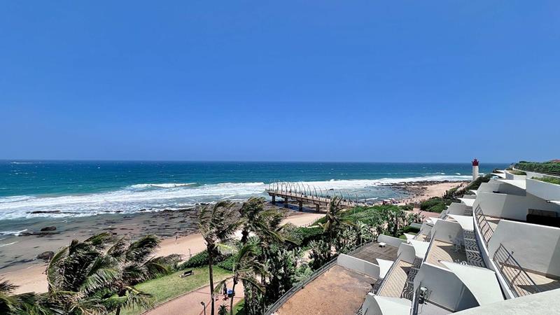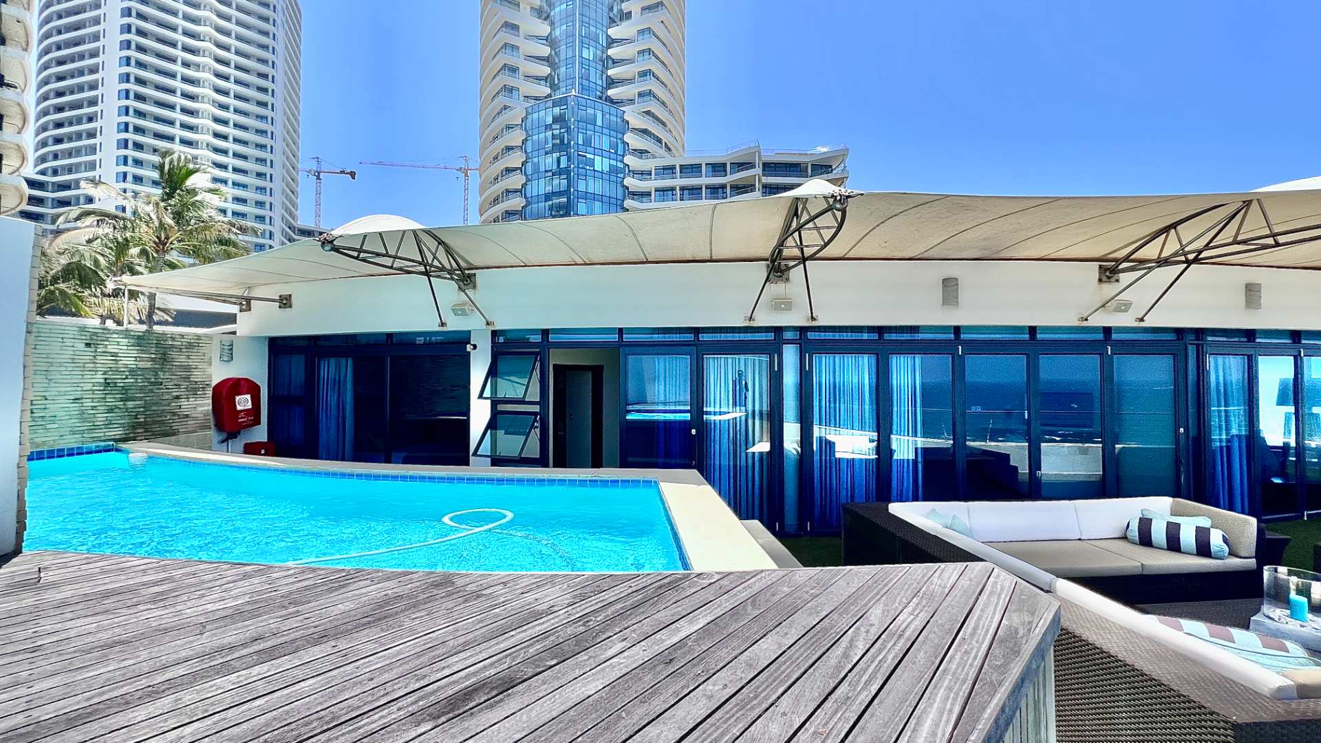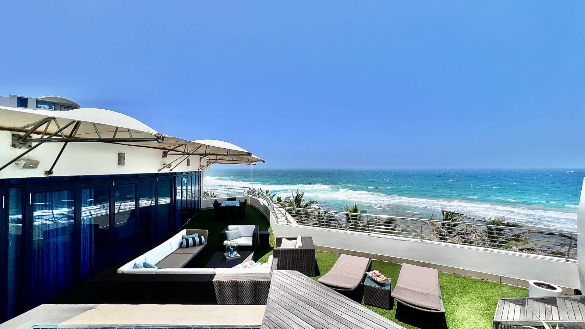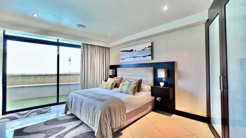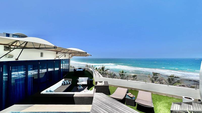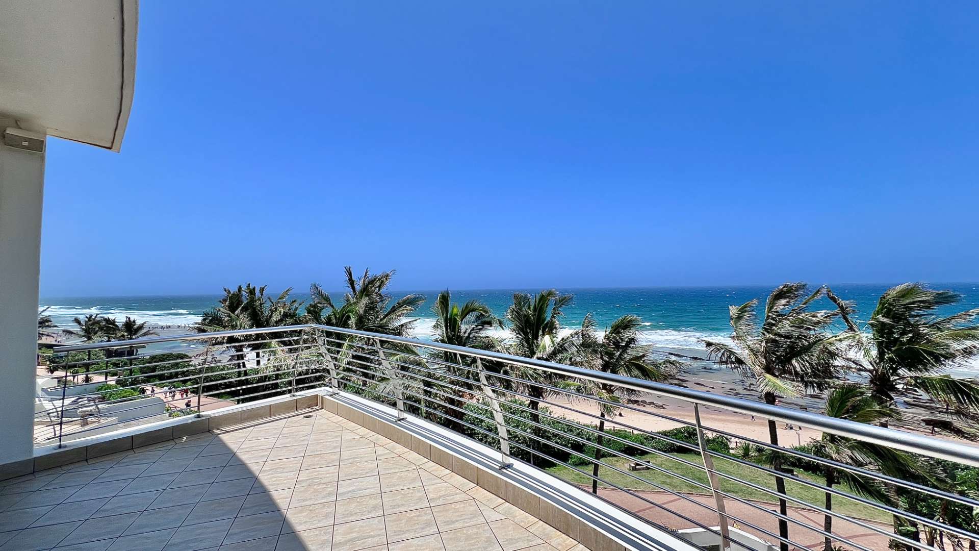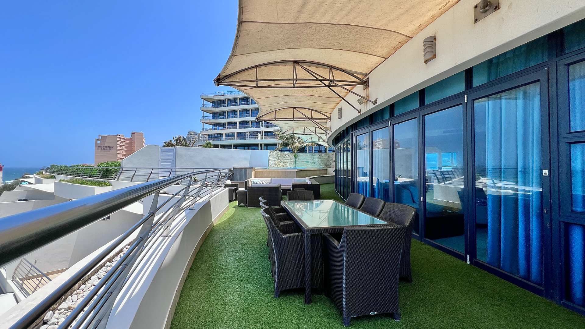 Upstairs, the apartment continues to impress with a dedicated entertainment area, opening onto another large balcony with space for outdoor seating and dining, as well as a private pool. The third bedroom is located on this level, also en-suite, with a double basin and bathtub, and direct access to the upper balcony. With multiple entertainment areas, generous proportions, and true beachfront positioning, this apartment offers a unique coastal lifestyle rarely found in Umhlanga.