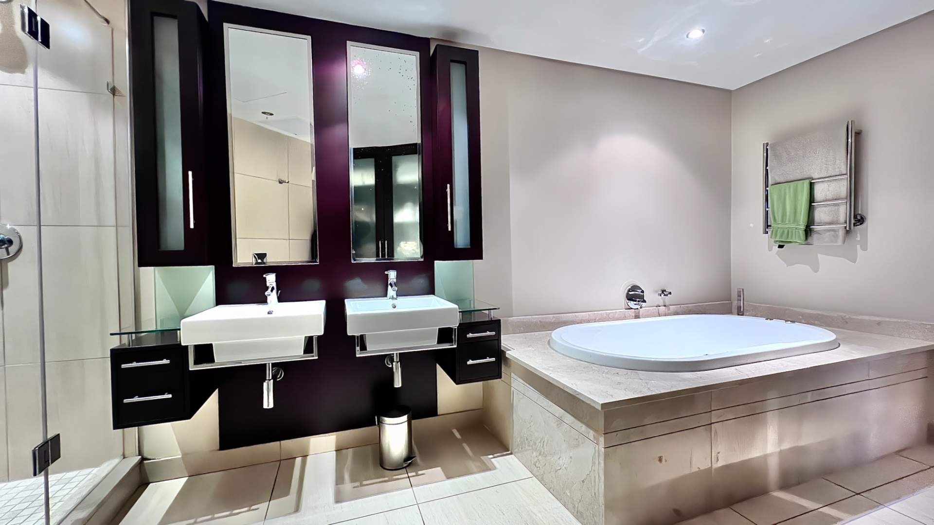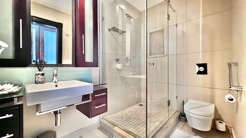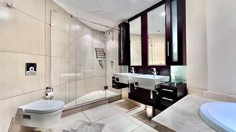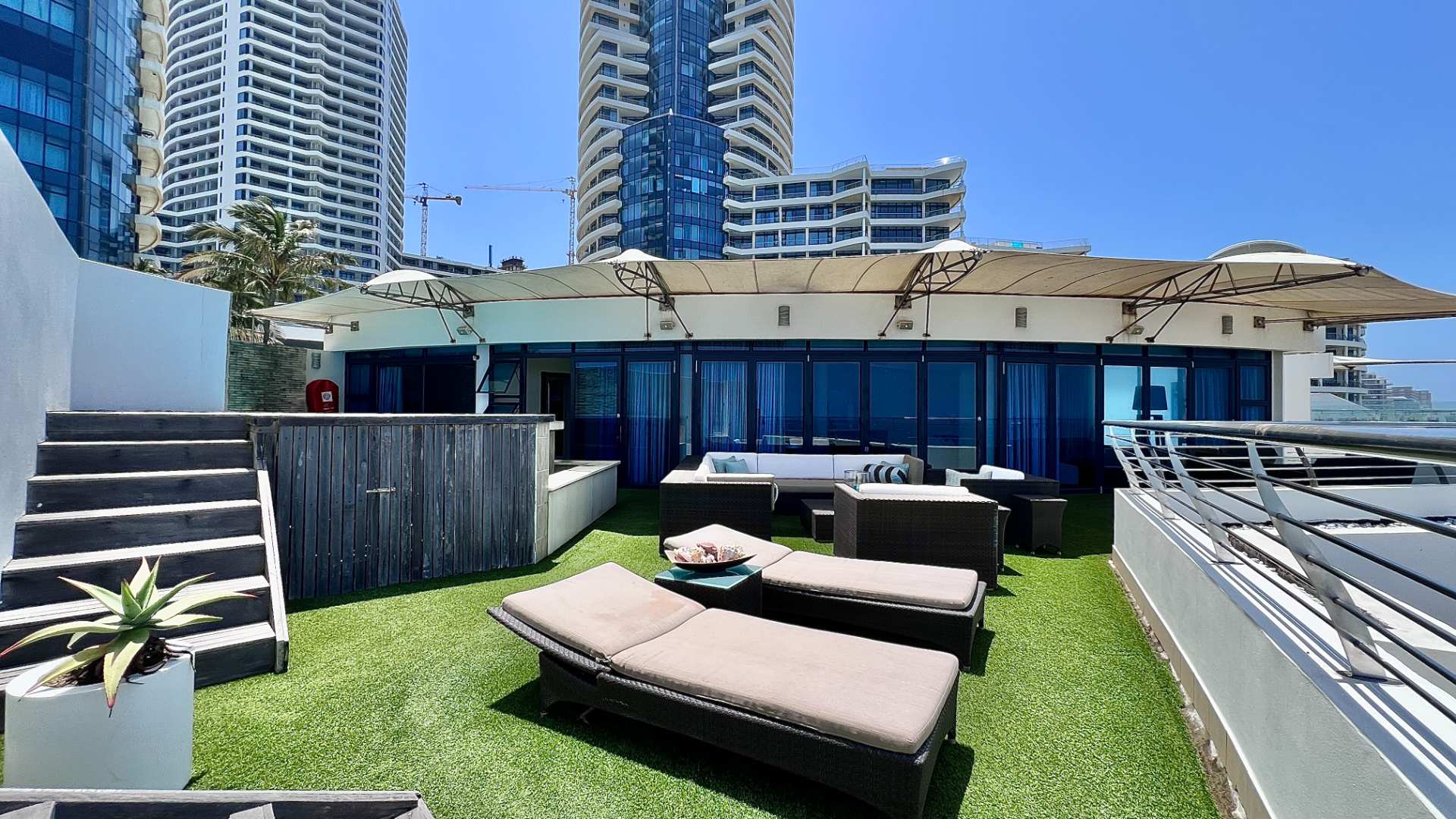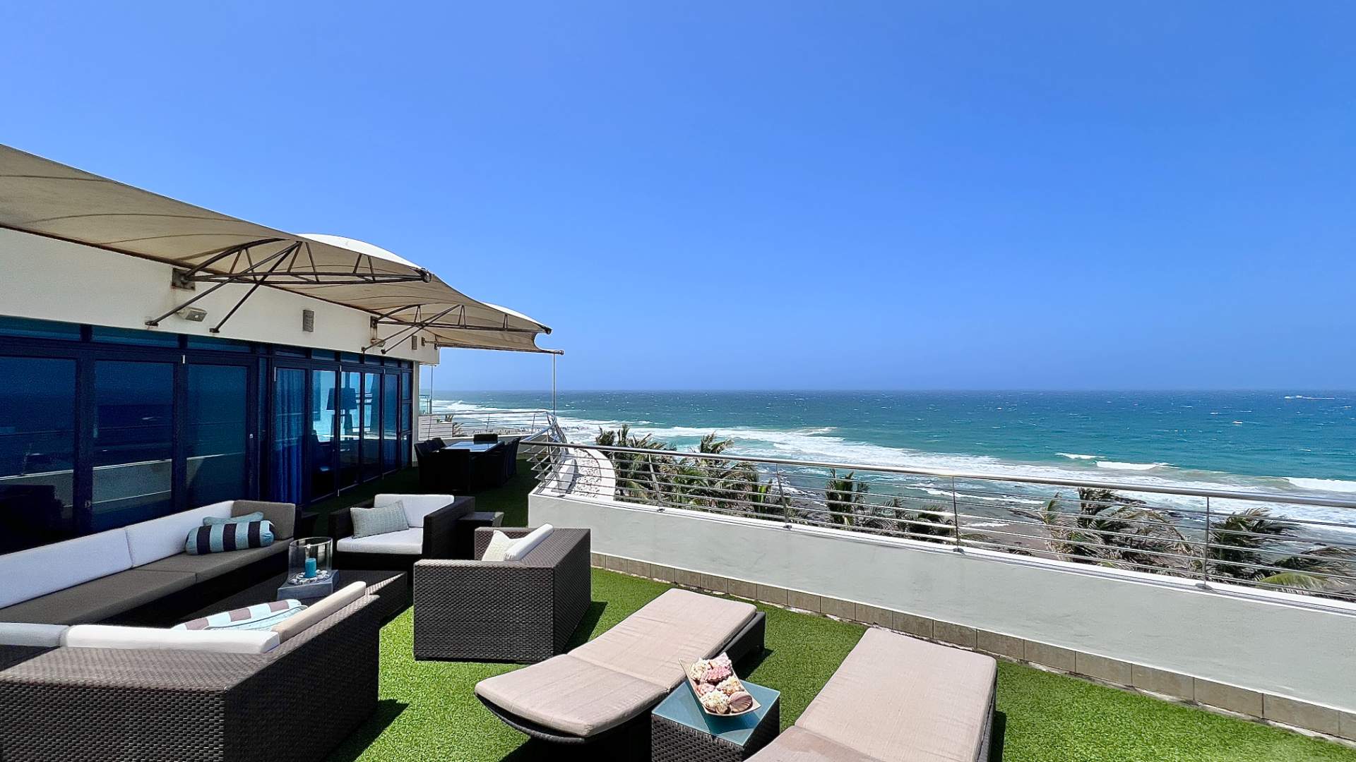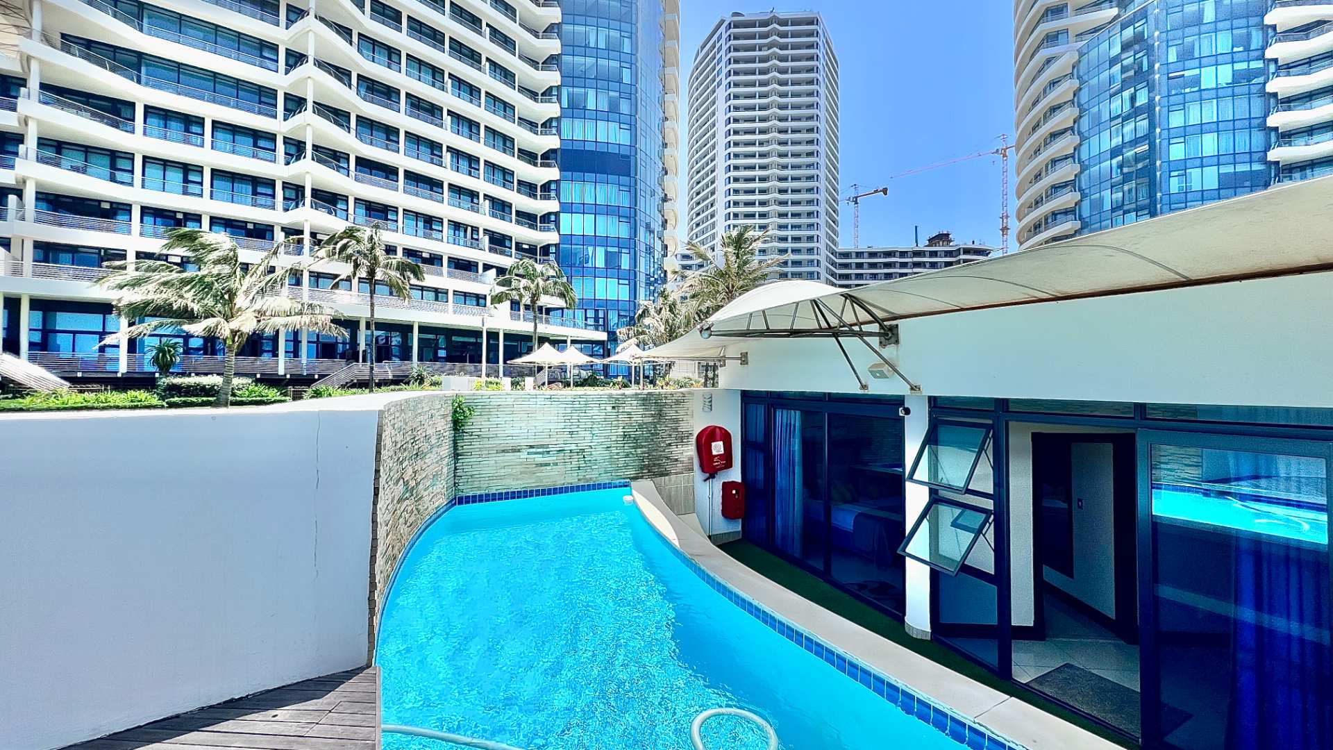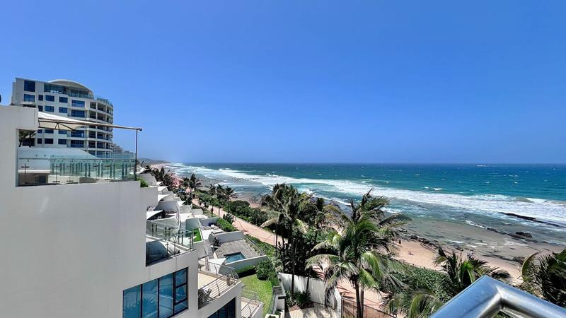 Upstairs, the apartment continues to impress with a dedicated entertainment area, opening onto another large balcony with space for outdoor seating and dining, as well as a private pool. The third bedroom is located on this level, also en-suite, with a double basin and bathtub, and direct access to the upper balcony. With multiple entertainment areas, generous proportions, and true beachfront positioning, this apartment offers a unique coastal lifestyle rarely found in Umhlanga.