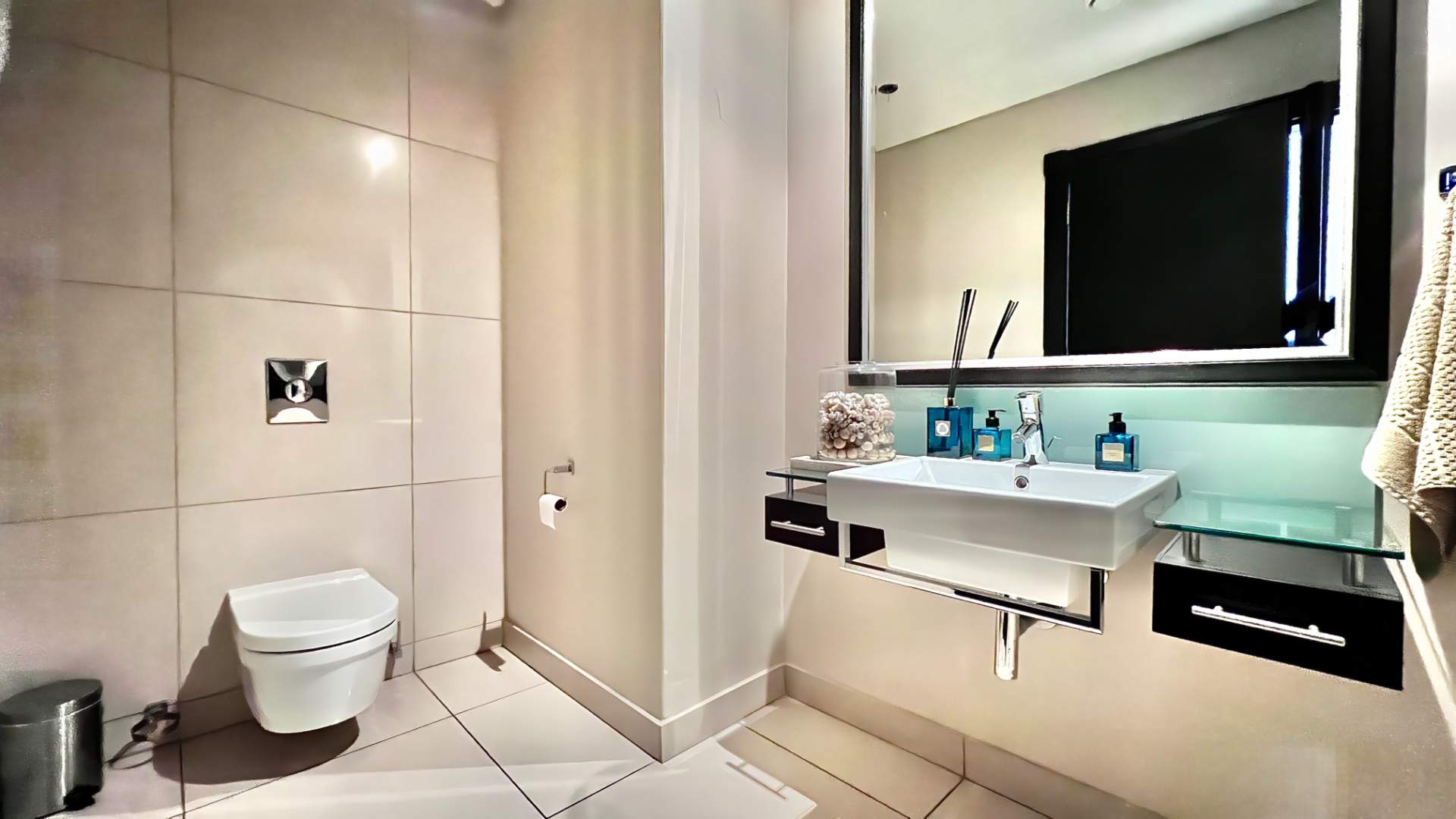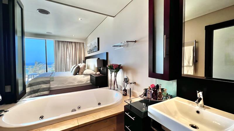 The main bedroom enjoys direct access to the same balcony and sea views, creating a calm and private retreat. It features a walk-in closet and a generous en-suite bathroom fitted with a double basin, shower, and bathtub. The second bedroom is also en-suite and opens onto the balcony, allowing both rooms to enjoy the coastal outlook and fresh sea air.